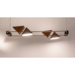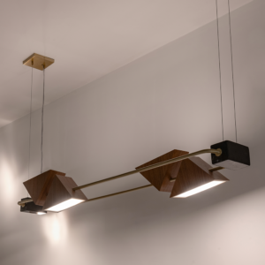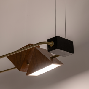 The song "Pela Luz Dos Olhos Teus", by Vinícius de Moraes in partnership with Tom Jobim, guided the creative process of Linha Vínculo, which seeks to represent the connection between people. The metal rod is the invisible guiding thread that unites the beings, the triangles symbolize the heads, the milky diffuser, the faces. The light represents the way people look when they meet, illuminating the moment. The stone base is the element that solidifies this union.